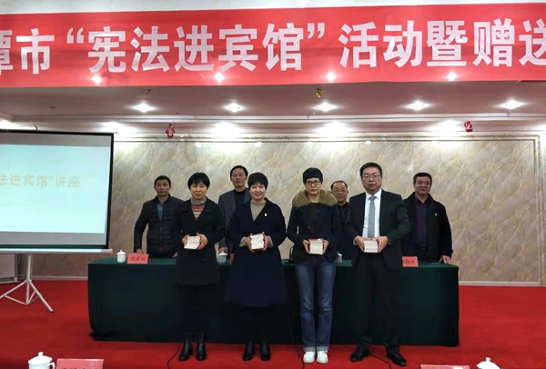 活动由市国资委副主任程明华主持,市法建办专职副主任王万春宣读了《市旅发委市国资委市普法办关于印发“宪法进宾馆”活动实施方案的通知》,365bet体育注册开户_mobilegame365_英国最大赌博365网站宾馆、华侨饭店、沁庐道苑、道源山庄代表接受捐赠宪法读本,市司法局普法科李桑进行了专题宪法知识讲座。